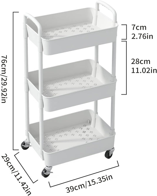Sywhitta 3-Tier Plastic Rolling Utility Cart with Handle, Multi-Functional Storage Trolley for Office, Living Room, Kitchen, Movable Storage Organizer with Wheels, White