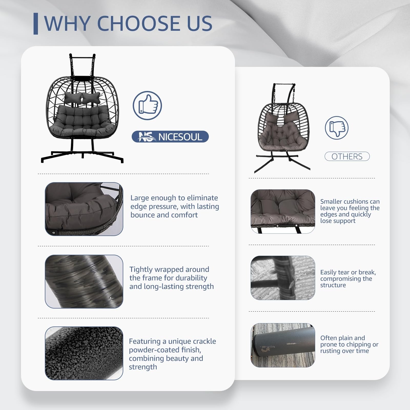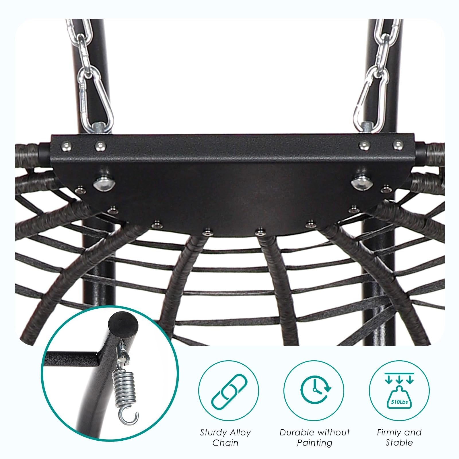 2 Person Double Egg Swing Chair with Stand Indoor Outdoor, Hammock Swing Chair Foldable Hanging Chair, Patio Wicker Hanging Egg Chair w/Cushion 700LBS Capacity for Bedroom, Balcony, Garden, Blue